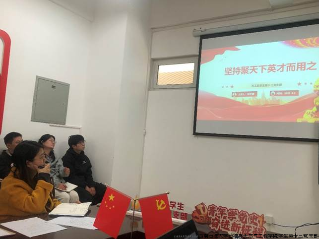 为深入学习贯彻习近平总书记重要讲话精神,提升党员的纪律意识和科研使命感。4月3日,石工院学生第十三党支部在明辨楼B527召开了主题党日活动,围绕“坚持一体推进‘三不腐’体制机制建设和坚持聚天下英才而用之”展开专题学习。大会由支部书记兰冰芯主持开展,支部全体党员到场参加。
