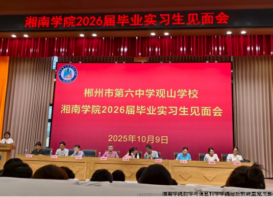 2025年10月9日,湘南学院2026届毕业实习生见面会在郴州市第六中学观山学校盛大召开。湘南学院相关负责人、郴州市第六中学观山学校领导班子、指导教师代表以及全体实习生共同参与,为即将开启的教育实习征程拉开序幕。