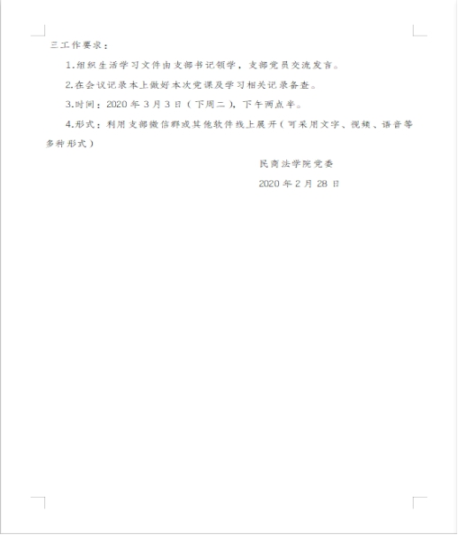民商法学院党委响应中央号召,安排各支部开展组织生活暨“讲好这一课”主题党日活动,希望各支部把这次战疫工作变为党员教育时机,选取本次战疫工作中某个角度形成讲稿,讲好2020年的第一次党课。