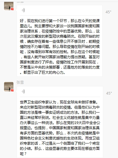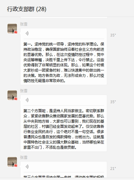 行政党支部张雪书记着重讲述了我国国家制度和国家治理体系在疫情防控中的显著优势,支部党员们信心坚定,相信在党中央的坚强领导下,在全国人民的共同努力下,一定能够打赢疫情防控阻击战。
