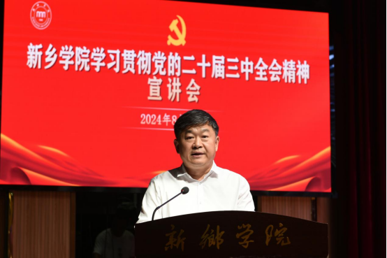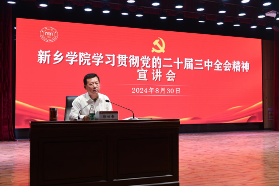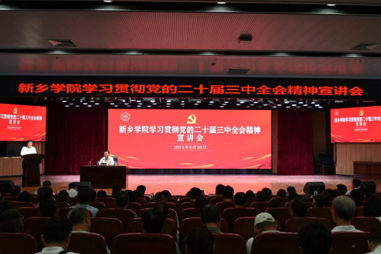 8月30日上午,新乡学院学习贯彻党的二十届三中全会精神宣讲会在文化艺术中心举行。校党委书记孙功奇宣讲党的二十届三中全会精神。校长王孝俊,党委副书记、工会主席高炜,党委副书记宋伟,纪委书记鲍晋选,副校长韩辉、杨钧、张银堂、陈磊山、赵伟杰出席会议,全体中层干部参加会议,会议由王孝俊主持。