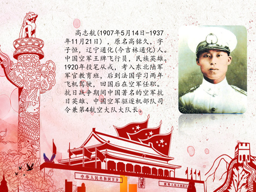 高志航(1907年5月14日-1937年11月21日) ,原名高铭久,字子恒,辽宁通化(今吉林通化)人。中国空军王牌飞行员,民族英雄。1920年投笔从戎,考入东北陆军军官教育班,后到法国学习两年飞机驾驶,回国后在空军任职。抗日战争期间中国著名的空军抗日英雄、中国空军驱逐机部队司令兼第4航空大队大队长。