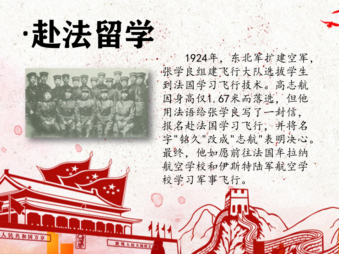 1924年,东北军扩建空军,张学良组建飞行大队选拔学生到法国学习飞行技术。高志航因身高仅1.67米而落选,但他用法语给张学良写了一封信,报名赴法国学习飞行,并将名字"铭久"改成"志航"表明决心。最终,他如愿前往法国牟拉纳航空学校和伊斯特陆军航空学校学习军事飞行。