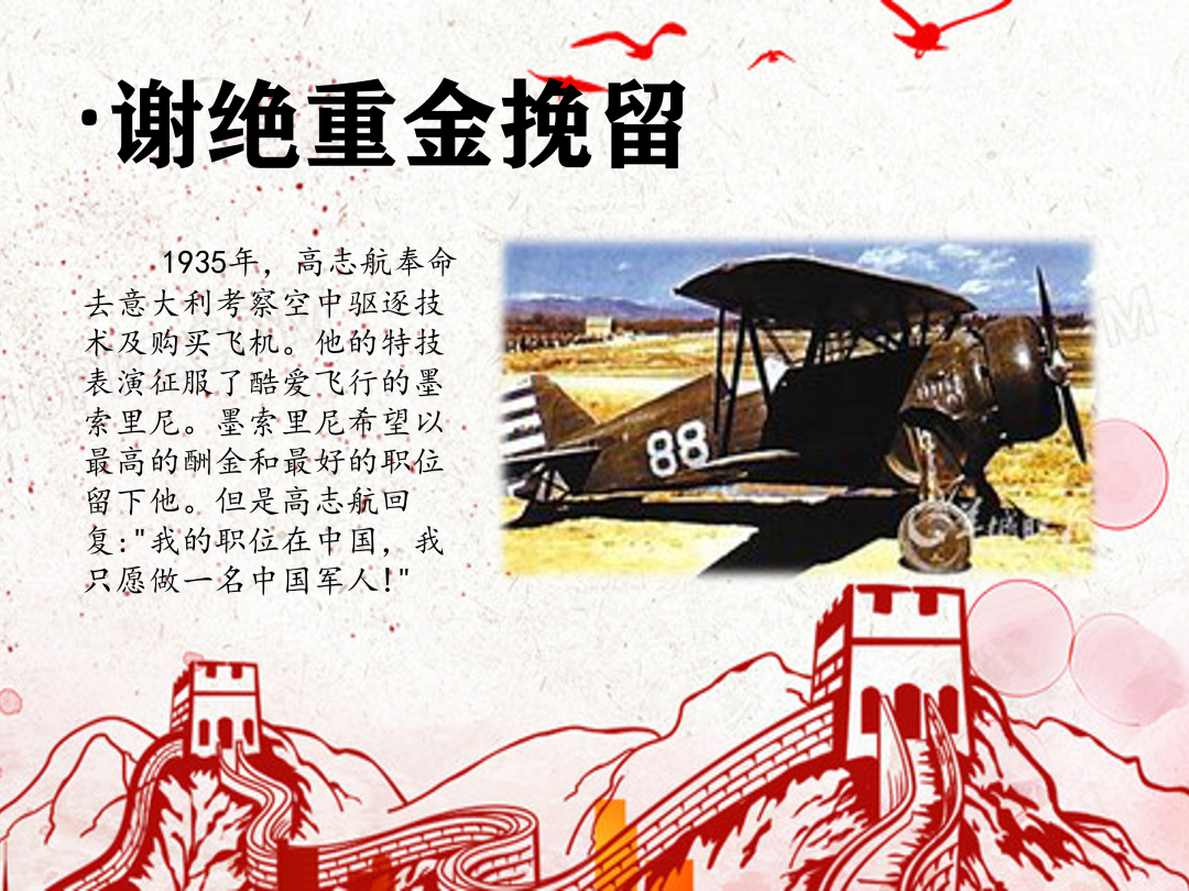 1935年,高志航奉命去意大利考察空中驱逐技术及购买飞机。他的特技表演征服了酷爱飞行的墨索里尼。墨索里尼希望以最高的酬金和最好的职位留下他。但是高志航回复:"我的职位在中国,我只愿做一名中国军人!"