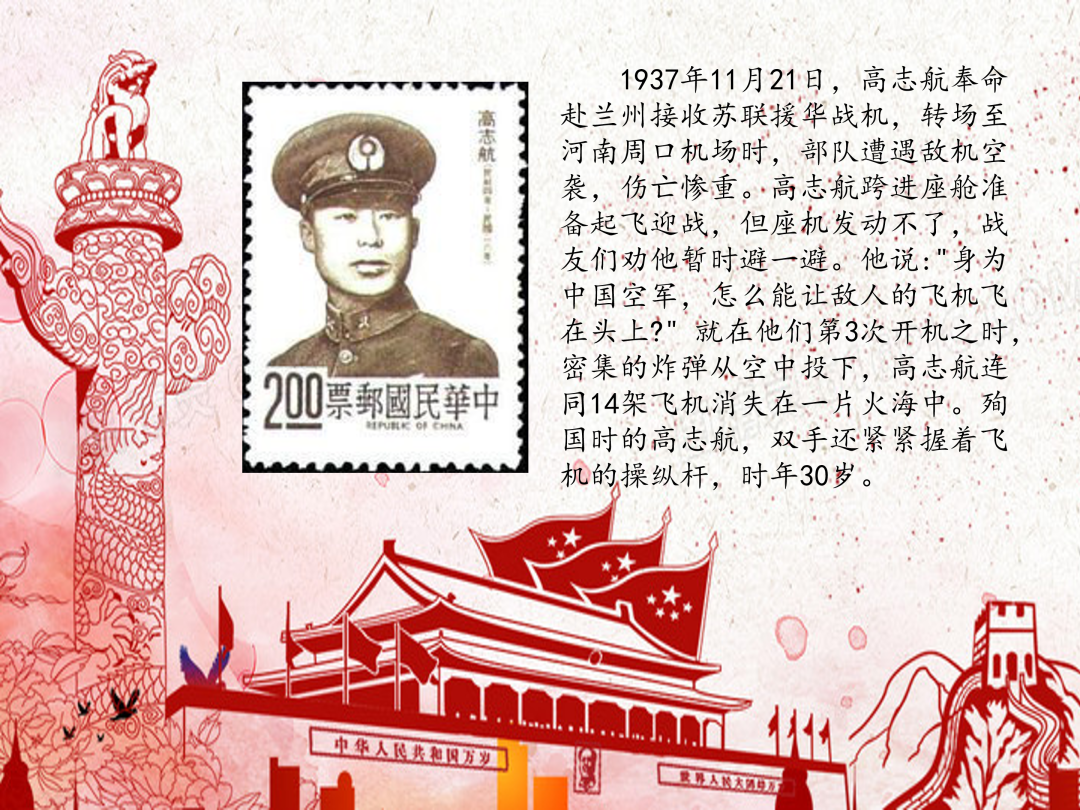 1937年11月21日,高志航奉命赴兰州接收苏联援华战机,转场至河南周口机场时,部队遭遇敌机空袭,伤亡惨重。高志航跨进座舱准备起飞迎战,但座机发动不了,战友们劝他暂时避一避。他说:"身为中国空军,怎么能让敌人的飞机飞在头上?" 就在他们第3次开机之时,密集的炸弹从空中投下,高志航连同14架飞机消失在一片火海中。殉国时的高志航,双手还紧紧握着飞机的操纵杆,时年30岁。
