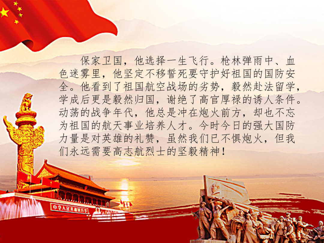 保家卫国,他选择一生飞行。枪林弹雨中、血色迷雾里,他坚定不移誓死要守护好祖国的国防安全。他看到了祖国航空战场的劣势,毅然赴法留学,学成后更是毅然归国,谢绝了高官厚禄的诱人条件。动荡的战争年代,他总是冲在炮火前方,却也不忘为祖国的航天事业培养人才。今时今日的强大国防力量是对英雄的礼赞,虽然我们已不惧炮火,但我们永远需要高志航烈士的坚毅精神!