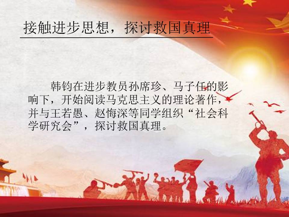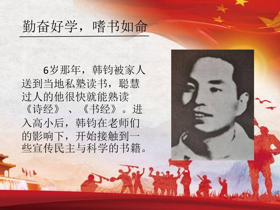 6岁那年,韩钧被家人送到当地私塾读书,聪慧过人的他很快就能熟读《诗经》 《书经》。进入高小后,韩钧在老师们的影响下,开始接触到一些宣传民主与科学的书籍。从那时起,韩钧立志将来要有一番作为。关于韩钧的勤奋好学,当地还流传着这样一个故事。当时常有“书倌”走街串巷,卖笔墨书刊。每逢“书倌”到来,韩钧总把“书倌”请到家里,管吃管住,热情招待。这样,他就可以趁夜翻阅“书倌”所带的书刊,往往彻夜不眠。
