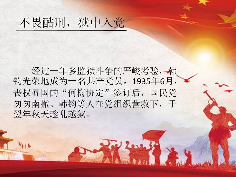 “九·一八”事变后,抗日怒潮席卷全国,韩钧在家乡为抗日奔走呼号,屡遭反动当局的追捕,于是决计前往北平,以旁听生的名义住进中国大学公寓,并积极参与到救亡运动中。后经介绍参加共青团,并受组织委派领导学生义勇军工作。翌年8月,韩钧在领导学生义勇军游行时,被反动军警逮捕。随后,被转到“北平军人反省院”。经过一年多监狱斗争的严峻考验,韩钧光荣地成为一名共产党员。1935年6月,丧权辱国的“何梅协定”签订后,国民党匆匆南撤。韩钧等人在党组织营救下,于翌年秋天趁乱越狱。