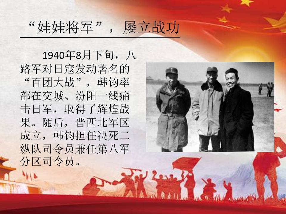 1940年8月下旬,八路军对日寇发动著名的“百团大战”,韩钧率部在交城、汾阳一线痛击日军,取得了辉煌战果。随后,晋西北军区成立,韩钧担任决死二纵队司令员兼任第八军分区司令员。1943年6月,“陕、甘、宁、晋、绥五省联防司令部”成立,韩钧被任命为司令部秘书长,成为贺龙的得力助手。
