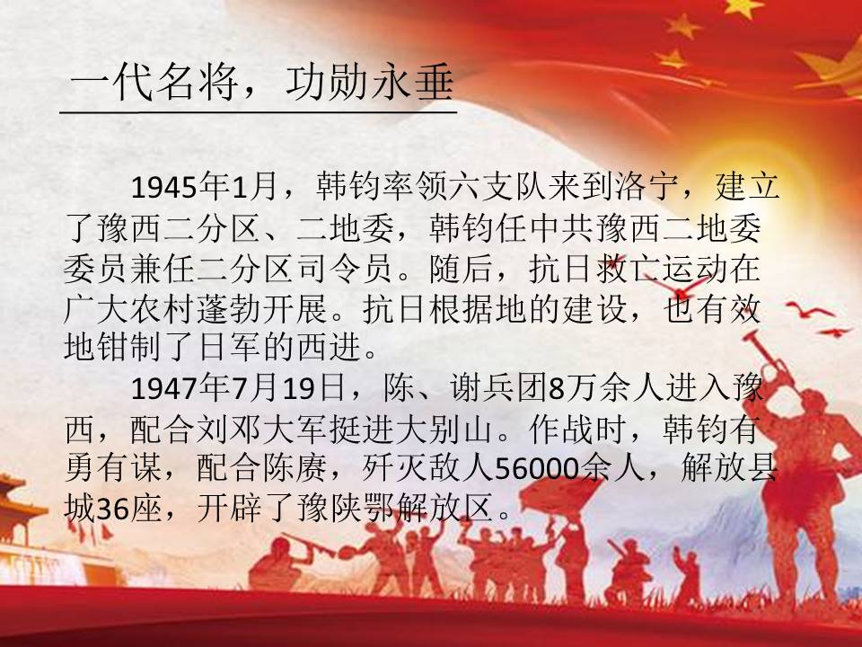 1947年7月19日,陈、谢兵团8万余人进入豫西,配合刘邓大军挺进大别山。作战时,韩钧有勇有谋,配合陈赓,歼灭敌人56000余人,解放县城36座,开辟了豫陕鄂解放区。