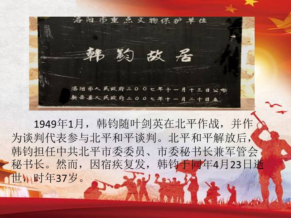 1949年1月,韩钧随叶剑英在北平作战,并作为谈判代表参与北平和平谈判。北平和平解放后,韩钧担任中共北平市委委员、市委秘书长兼军管会秘书长。然而,因宿疾复发,韩钧于同年4月23日逝世,时年37岁。