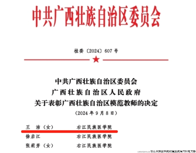 【喜讯】祝贺!右医附院肾内科主任、肾脏病学教研室主任王洁教授荣获“广西壮族自治区模范教师”称号