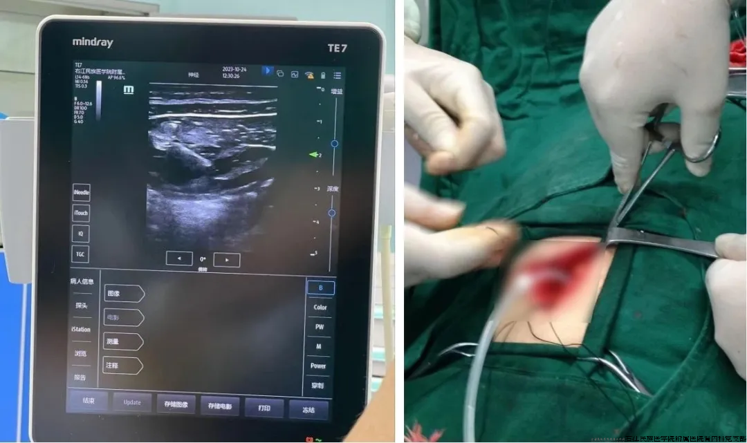 在手术过程中,由右医附院麻醉科毛新俊博士对患者进行主麻,团队凭借精湛的技术和丰富的经验,成功为患者实施了超声引导下腹横肌阻滞麻醉。在麻醉效果满意后,右医附院肾内科主任王洁教授团队顺利完成了腹膜透析置管,成功解决了患者后续透析问题。