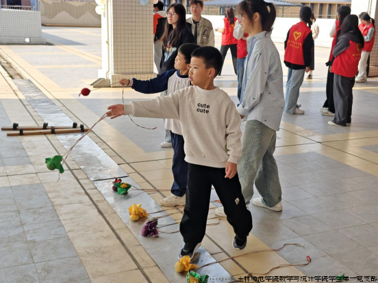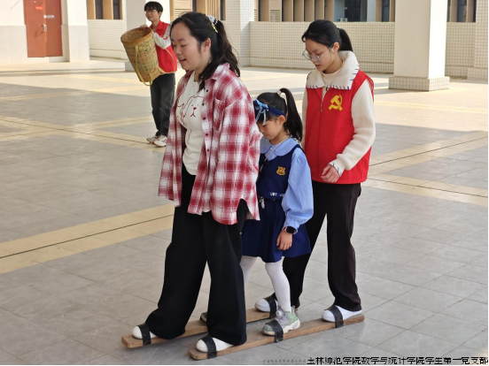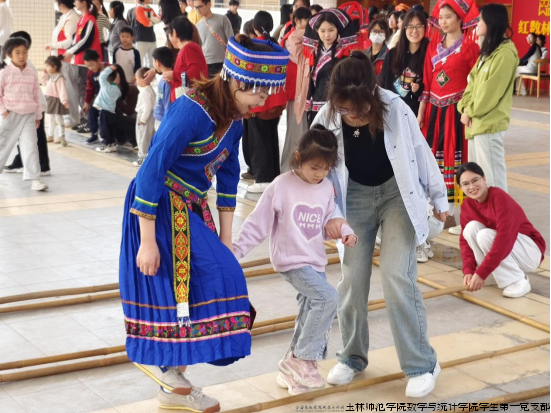 在三人板鞋竞速赛现场,党员志愿者们细致地教导小朋友们如何协调身体动作、保持步伐一致,助力他们齐心协力奔向终点。与此同时,在竹竿敲击的清脆声响与民族音乐的韵律交织中,身着民族服饰的志愿者们引导小朋友们感受节拍、掌握技巧。小朋友们随后在竹竿的开合间灵活地跳跃、穿梭,成功跨越竹竿阵,仿佛跳起了一曲灵动的舞蹈,现场洋溢的欢乐气氛感染了每一位在场者。