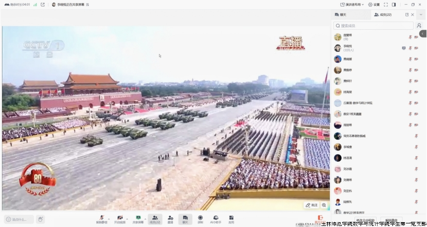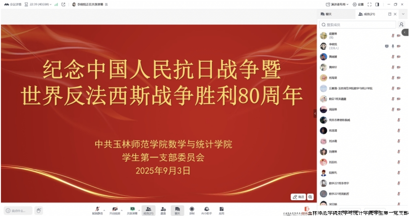 为纪念中国人民抗日战争暨世界反法西斯战争胜利80周年,弘扬伟大抗战精神,增强党员的爱国情怀,9月3日,数学与统计学院学生第一党支部组织全体党员同志通过线上方式集中观看九三阅兵,共同缅怀历史,汲取奋进力量。