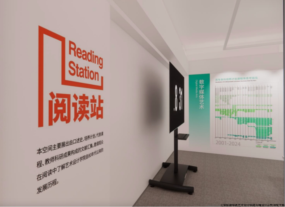 “阅读站”:同位于综合楼9层,链接“迴廊”,展示了艺术设计学院四个国家一流本科专业建设专业的创办与发展历程,其中的课程体系发展、特色课程的形成以及教师学术成果的凝结,是学院各专业响应国家和社会需求发展自身的见证,在屏幕中播放的“口述史”内容,是对学院历史和学院精神的更加生动的呈现。同时,可以深度阅读到围绕本科教学和课程建设的历史文献,以及教师的教研出版物。