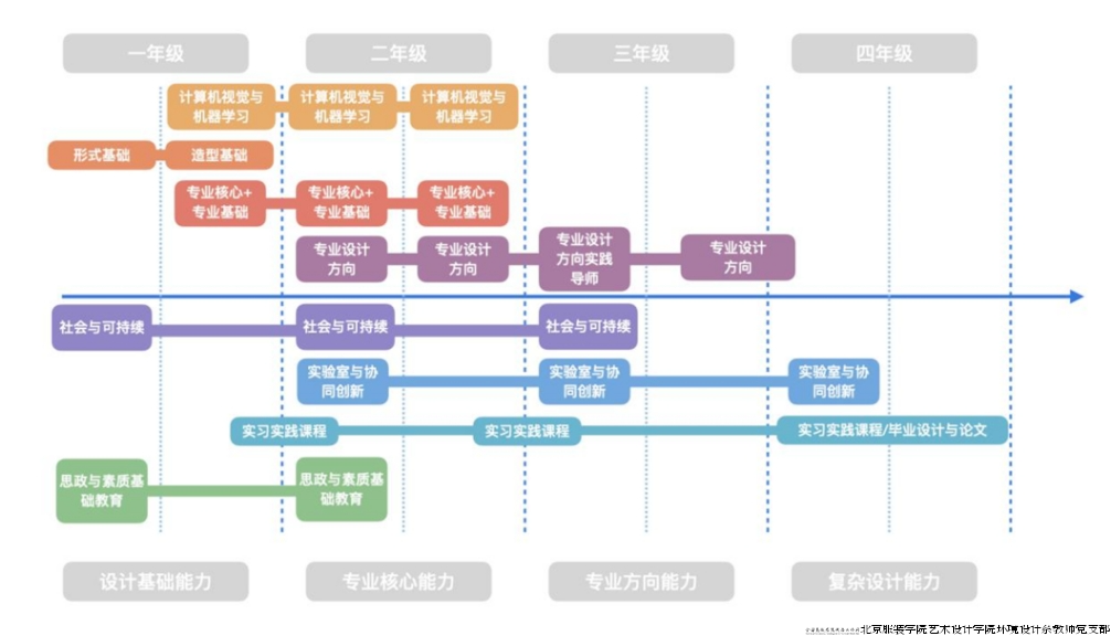 分别从“深度、强度、广度”三个维度加强学科深度、强化专业基础、拓宽专业方向,形成“设计理论与方法”、“形式与表达”、“新工科基础”、“设计文化与社会系统”、“设计核心与专业基础”、“模块专属与领域方向”六大课程版块。筑牢根基,开发面向未来的设计师基础课程平台。