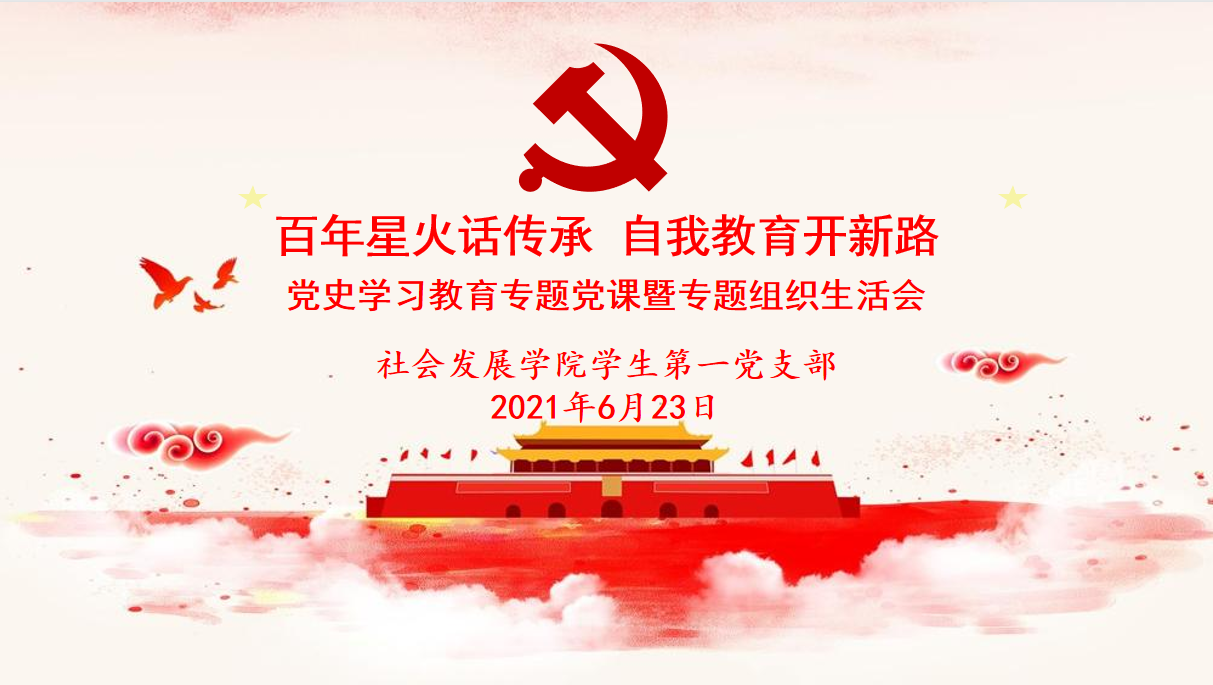 今年是中国共产党成立一百周年,为落实习近平总书记提出的在全党开展党史学习的要求,扬州大学社会发展学院学生第一党支部于6月23日下午2点30分开展了“百年星火话传承,自我教育开新路”党史学习教育专题党课暨专题组织生活会。