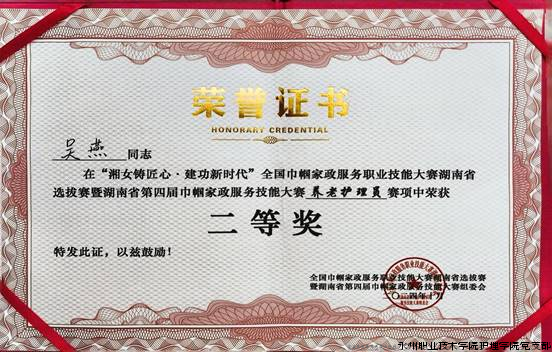 长期来,我院一直秉承“以赛促教、以赛促改”的理念,强化师生的教、学能力和综合素养,优化教学改革,促使教师在职业能力了大幅度提升,成绩斐然。2024年10月16日至18日,“湘女铸匠心,建功新时代”全国巾帼家政服务职业技能大赛湖南省选拔赛暨湖南省第四届巾帼家政服务技能大赛在湖南省岳阳职业技术学院顺利进行,我校护理学院吴燕老师、谢培娟老师分别参加了养老护理员、母婴护理员2个赛项,本次比赛由护理学院副院长唐萍教授、陈颖超副教授带队。经过两天紧张激烈的角逐,吴燕老师凭借扎实的理论知识、精湛的操作技能,在全省11所高职院校中脱颖而出,以理论+操作综合全省第二名的成绩荣获养老护理员赛项二等奖,永州职业技术学院荣获优秀组织奖!