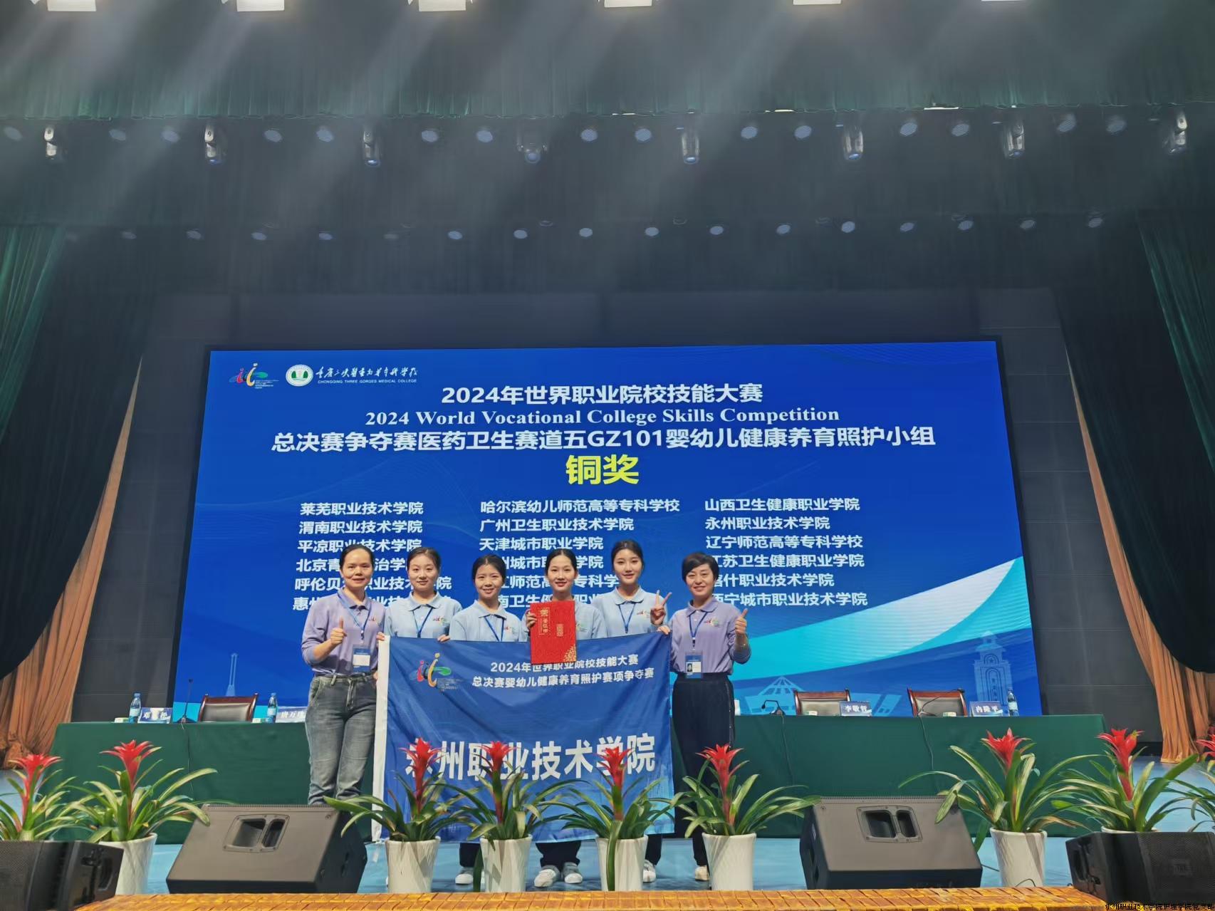 2024年10月26-30日,世界职业院校技能大赛高职组“婴幼儿健康养育照护”赛项在重庆三峡医药高等专科学校举行,本次大赛由教育部等35个单位主办,来自31个省、自治区、直辖市的60支代表队,212名参赛选手同台竞技,经过3天的激烈角逐,由护理学院唐萍副院长为领队,孟火娟、唐玲芳为指导老师,李萍、徐玉洁、蒋静、曾腾露同学为参赛选手的永州职业技术学院代表队荣获铜奖。