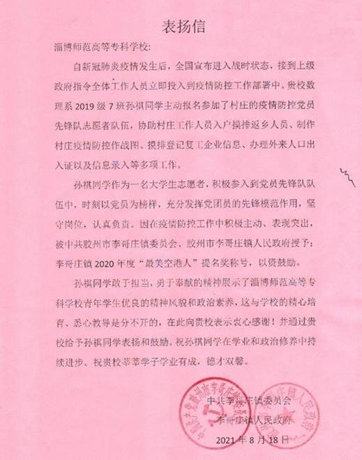 近日,数理系收到了一封来自山东省青岛市的表扬信,信中郑重表扬了我校数理系孙祺同学为胶州市李哥庄镇人民政府疫情防控工作做出的积极贡献,并向我校表示了感谢。