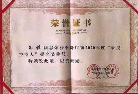 孙祺同学是我校数理系2019级数学教育专业7班的学生,来自青岛市胶州市李哥庄镇。在疫情防控的紧要关头,孙祺同学主动报名参加了当地的疫情防控党员先锋队志愿者队伍,协助村庄工作人员入户摸排返乡人员、制作村庄疫情防控作战图、摸排登记复工企业信息、办理外来人口出入证以及信息录入等多项工作。村内辖区的企业和外来人员较多,工作量大,但她毫无怨言,全心全意地协助村庄工作人员投入到防疫工作中,为村庄防疫工作献出了自己的力量。因为她在疫情防控工作中积极主动、认真负责、工作突出,被授予:李哥庄镇2020年度“最美空港人”提名奖称号。