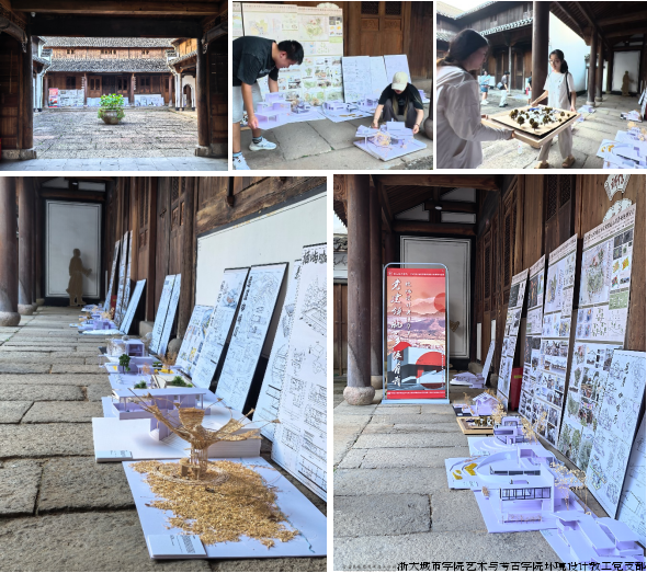 (三)成果展示与社会反馈:成功在大汤坞新村省级文保单位汤寿潜故居举办“党建领航·乡振有我”课程设计成果展,集中展示同学们基于大汤坞村真题的设计作品。展览获得了当地政府、村民和来访游客的高度评价,成为校地共建成果的一次集中亮相,也为学生提供了宝贵的公开展示和交流机会。