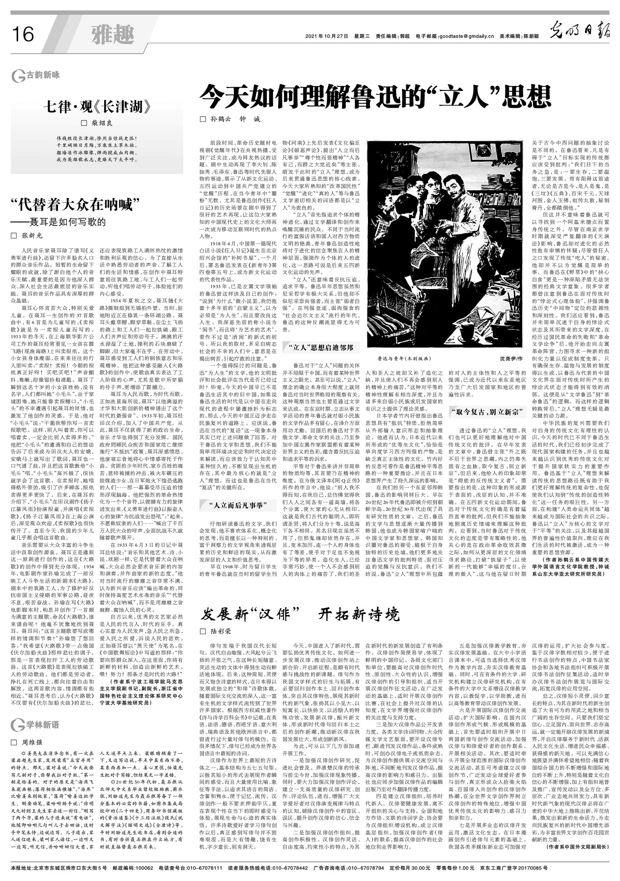 早在1908年,时为留日学生的青年鲁迅就在当时的留学生刊物《河南》上先后发表《文化偏至论》《破恶声论》,提出“人立而后凡事举”“尊个性而张精神”“人各有己,而群之大觉近矣”等主张。萌发于此时的“立人”理想,成为后来贯通鲁迅思想的核心线索。今天大家所熟知的“改革国民性”“觉醒”“进化”“真的人”等与鲁迅文学密切相关的词语都是以“立人”为底色的。