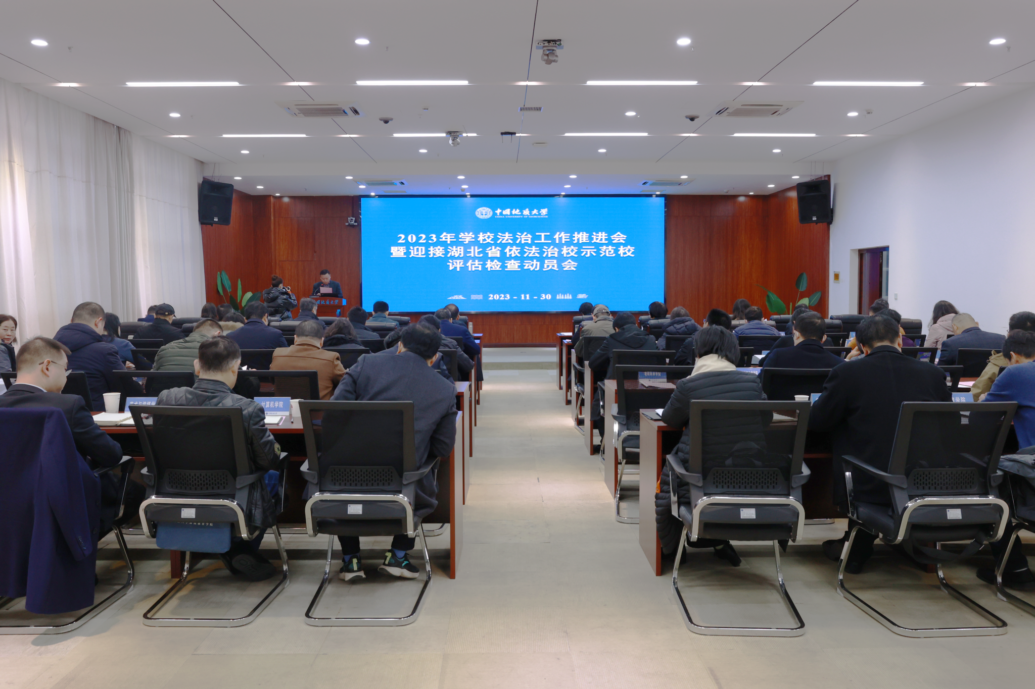 近期,我校法治工作推进会暨迎接湖北省依法治校示范校评估检查动员会召开。校党委书记黄晓玫、学校依法治校工作领导小组成员单位负责人、各管理服务机构及教学科研机构法治工作负责人参会。校党委副书记王林清主持会议。