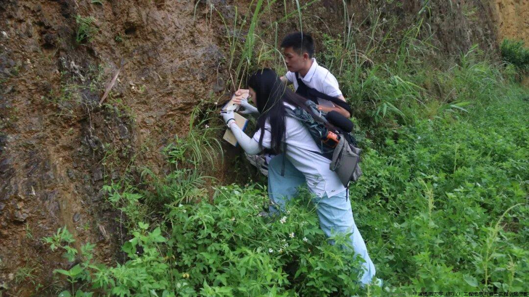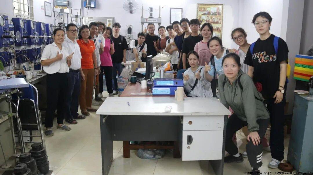 7月28日,实习团队从河内驱车前往和平省枚州县开展区域工程地质实习,认识越南的断层情况,了解越南西北部的典型地质构造。在途中某加油站旁观察了一断层构造。河内矿业与地质大学Bui Van Binh博士讲解道,该地质点位是较为特殊的逆断层,断层带厚度2米,多层带内可以观测到较为破碎岩体。并且在其中贯穿着褶皱地层。学生进行断层面产状现场测量。