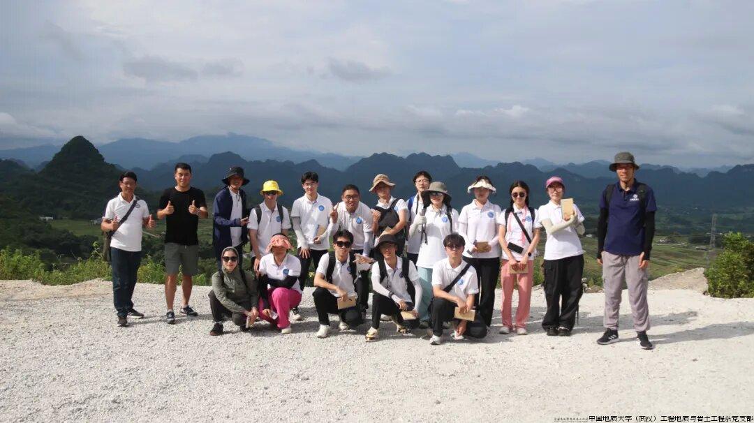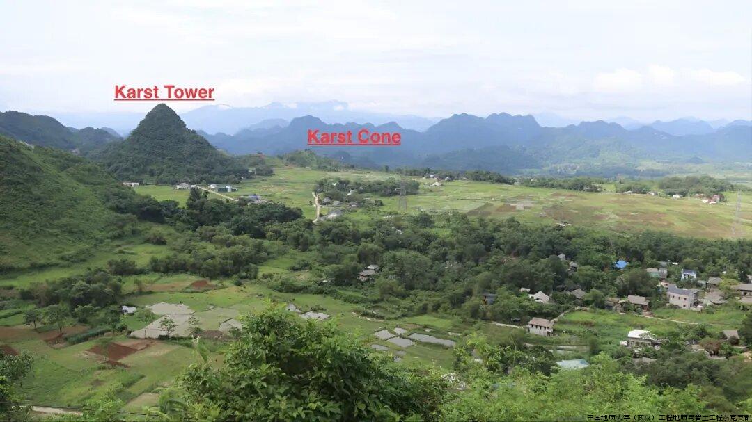 紧接着团队来到了越南和平省枚州县,开展枚州县区域工程地质实习,了解越南西北部的典型喀斯特地貌。该区域岩性为白云质灰岩,表面发育刀砍纹;有典型的Karst Tower、Karst Cone,地表有第四纪河流冲积物,厚度约10米。在实习观察中发现该处地区也有很明显的山脊分水岭现象。两侧分别为Song Ma River和Song Da River流域。