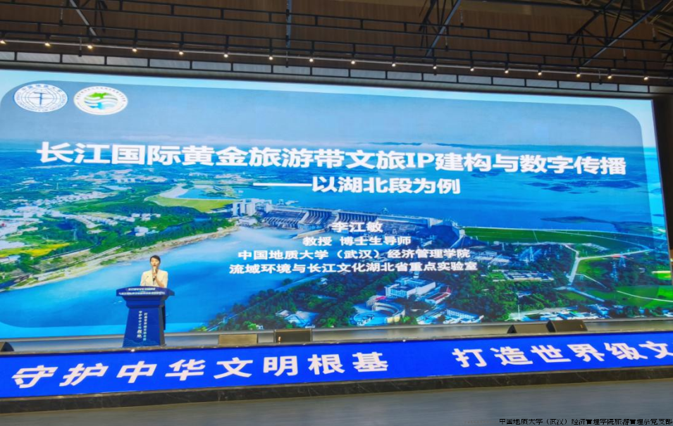 中国地质大学(武汉)经济管理学院旅游管理系党支部书记、流域环境与长江文化湖北省重点实验室副主任、全国高校“双带头人”教师党支部书记“强国行”专项行动团队负责人李江敏教授应邀参会并以《长江国际黄金旅游带文旅IP建构与数字传播》为题发表主旨演讲。