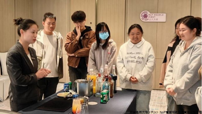 活动尾声的调酒教学“彩蛋”,为实践课堂增添了更多趣味。酒店大堂吧副经理江露露女士现场演示鸡尾酒调制技艺,从基酒选择到色彩搭配,每一步讲解清晰生动,颜值与口感兼具的鸡尾酒瞬间俘获同学们的关注。在江女士的指导下,同学们纷纷动手尝试,亲手调配专属鸡尾酒,在实践中感受酒店餐饮服务的创意与魅力,现场充满欢声笑语。