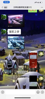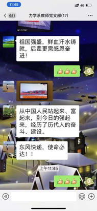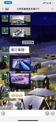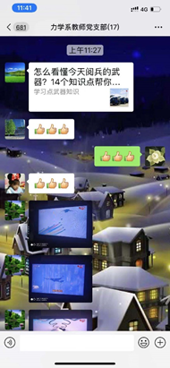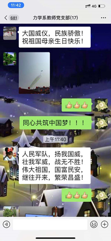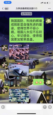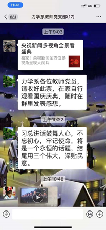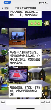 2019年10月1日上午10:00,庆祝中华人民共和国成立70周年大阅兵在北京天安门广场隆重举行。力学系教师组织全体党员教师采用分散收看直播,同时以微信群聊的方式集中发表感想,进行热烈的讨论。进一步了解和感受新中国成立70周年来所取得的伟大成就,表达对祖国的热爱和美好祝愿。