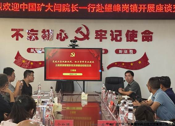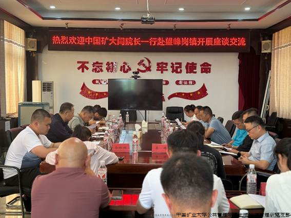 闪坤镇长致欢迎辞,对土地资源管理系党支部师生赴望峰岗镇政府调研座谈表示热烈欢迎,并介绍了望峰岗镇的基本情况以及未来发展方向,全面展示了望峰岗镇从依赖煤矿开采到绿色发展的转型之路。随后,闫庆武副院长介绍了中国矿业大学公共管理学院(应急管理学院)学院的基本情况;土地资源管理系党支部书记王培俊介绍了土地资源管理学科的基本情况以及土地资源管理系党支部的建设经验及成效,同时表示希望与望峰岗镇政府建立长久联系,通过开展“强国行”专项行动,为望峰岗镇的煤矿采后土地功能提升和产业转型发展提供建议,全面提升人才培养质量。随后双方围绕调研主题进行了充分讨论。