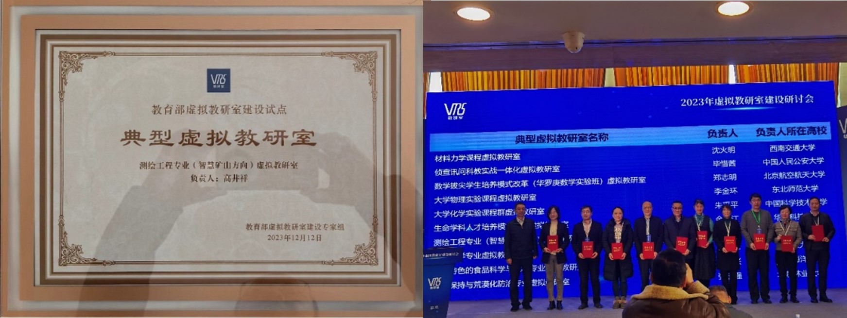 2023年12月23日,虚拟教研室建设研讨会在武汉召开,虚拟教研室建设专家组发布了《关于发布虚拟教研室试点建设典型名单的通知》,我系高井祥教授作为负责人的教育部测绘工程专业(智慧矿山方向)虚拟教研室入选典型虚拟教研室并在会上获得表彰。