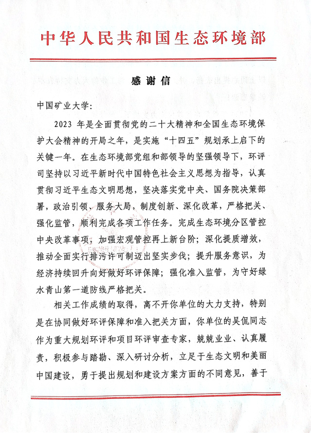 近日,生态环境部环境影响评价与排放管理司向我校发来感谢信,感谢2023年我校对生态环境部相关工作的大力支持。信中提及在协同做好环评保障和准入把关方面,我校环境与测绘学院测绘工程系吴侃教授作为重大规划环评和项目环评审查专家,认真履责,勇于提出规划和建设方案方面的不同意见,善于提出加强生态环境保护的合理化建议,为综合决策提供了科学精准的支撑。