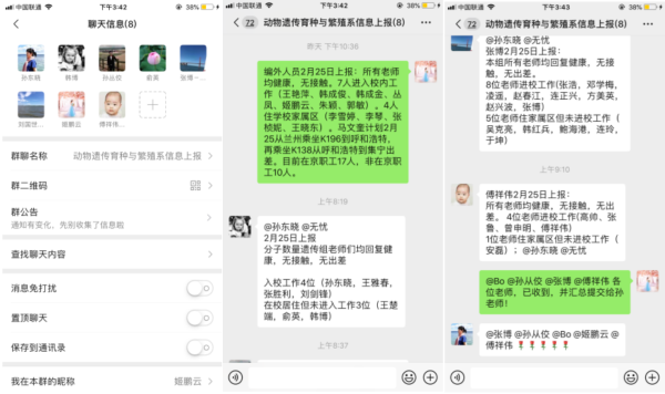 疫情期间,党支部高度重视疫情防控知识的普及和思想情绪的疏导,支委时刻关注湖北2名教职工的健康和心理状况,引导支部的教职工们不造谣、不传谣、不信谣,学习正确有效的防疫知识。在系主任孙东晓教授的带领下,支部党员刘国世、俞英、傅祥伟、孙从佼、韩博、张博、姬鹏云等几位党员负责每天报送动物遗传育种与繁殖系41位在编职工和27位编外职工的健康状况、个人及家属是否有接待湖北来的客人、是否有出差计划、是否有返程计划以及返程后自行隔离地点、当天是否入校园工作或是否居住在学校家属区等情况;党员俞英、刘国世对接两位回家过年的湖北籍科研助理,帮助他们解决疫情期间的实际困难;“微信群+私信+短信+电话”的高度结合和认真负责、保证全覆盖的严肃态度让全系的防疫工作得以顺利开展,充分发挥了党员的先锋模范带头作用与无私奉献的精神。