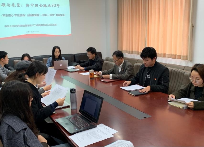 2019年11月6日下午,财政金融学院2019级金融专硕二班党支部“不忘初心、牢记使命”主题党课在明德主楼610会议室顺利召开。本次党课由我院副院长、支部“一联系一帮扶”指导教师赵锡军教授主讲。党支部书记李昂同志主持本次活动,支部全体党员、入党积极分子代表到场聆听。