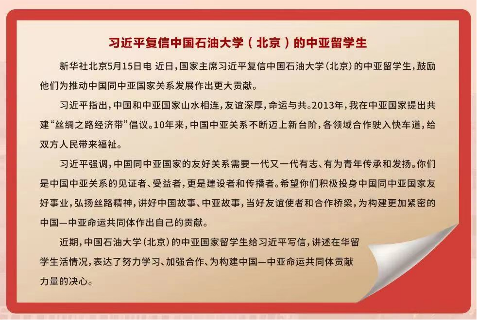 2023年5月,国家主席习近平复信中国石油大学(北京)的中亚留学生,鼓励他们弘扬丝路精神,讲好中国故事,当好友谊使者和合作桥梁。