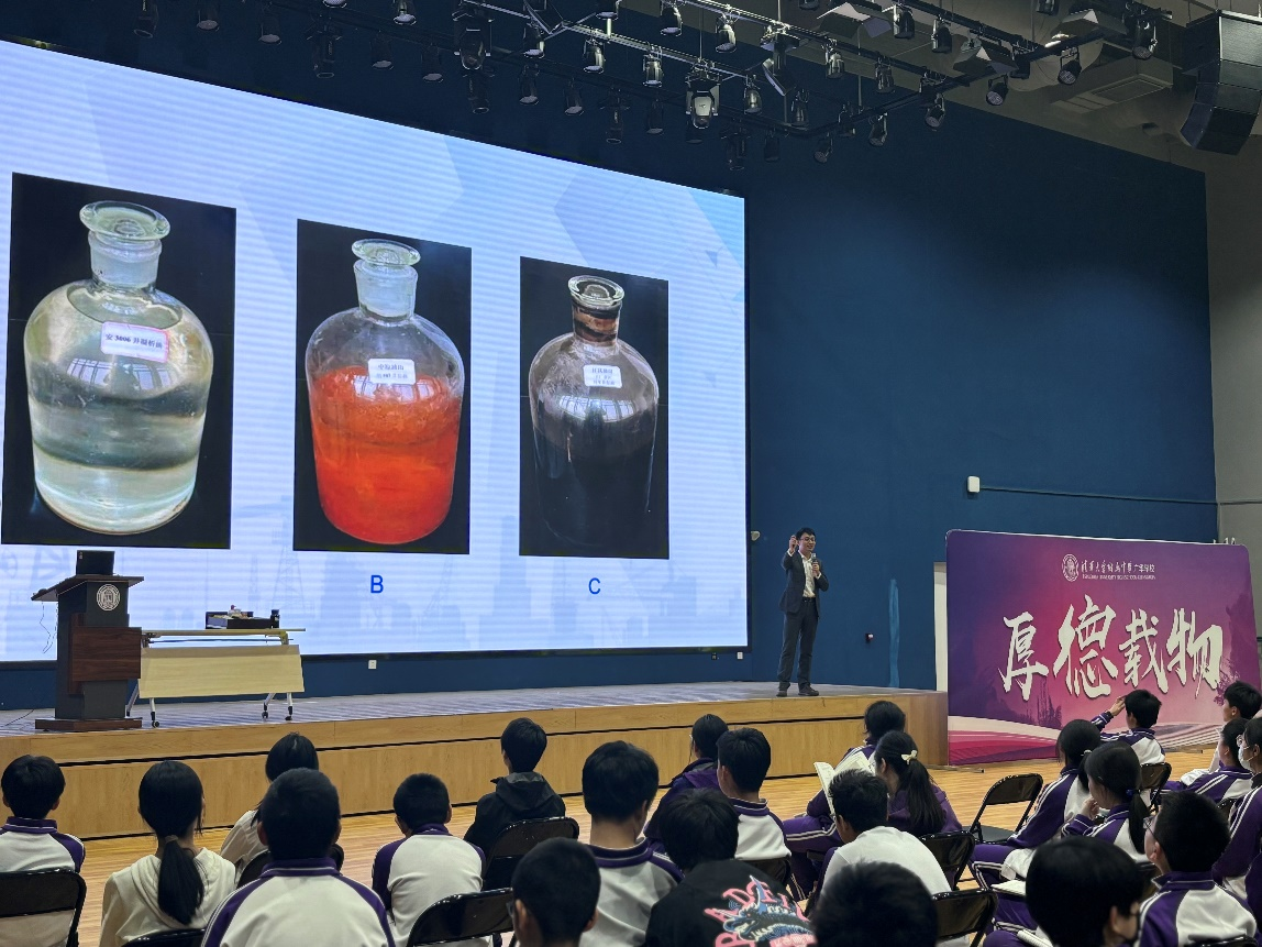 仪式结束后,地球科学学院油气勘探与开发地质系主任李庆为广华学校师生们开展了石油知识科普讲座,讲座围绕“石油的形成、勘探、开采、生活用途”方面,介绍了什么是石油、石油的形成与开发利用,以及在双碳背景下石油的发展,展示了地质勘探和开采相关技术。