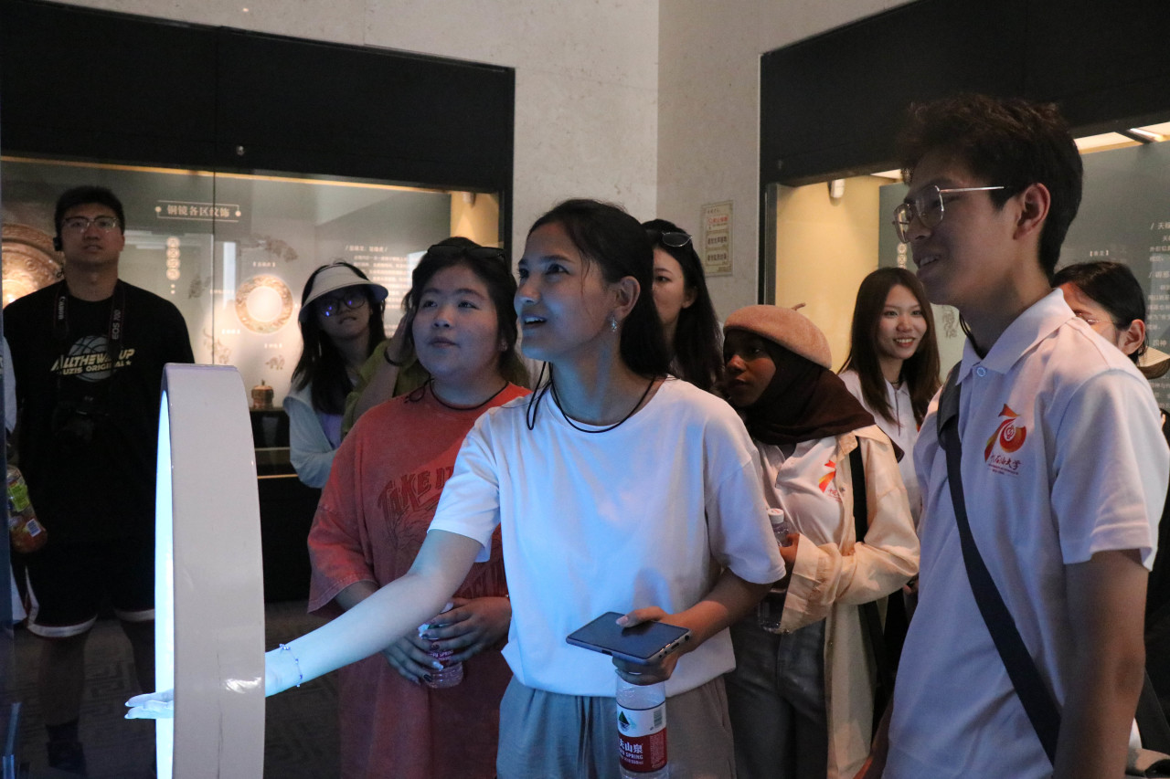 伴随着解说员的讲解,中外成员互相探讨、了解大唐时期的政治制度、经济状况、科技发展以及社会生活等方面的情况,为唐代的繁荣景象和杰出的文化成就深感震撼。除了参观展览,学生们还通过最新多媒体技术全方位触摸旋转铜镜,深入感受汉镜的魅力和独特性。