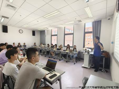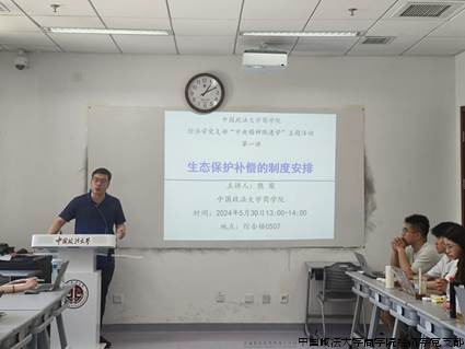 2024年5月30日下午,经济学党支部、2022-2023级学硕党支部在学院路校区图书综合楼507教室,联合开展“中央精神跟进学”主题活动第一讲。本次活动由经济学党支部书记黄立君老师主持,经济学党支部组织委员熊柴老师主讲,以“生态保护补偿的制度安排”为主题,旨在深入学习中央精神,加强党员师生和入党积极分子对国家出台的政策法规的理解认识。