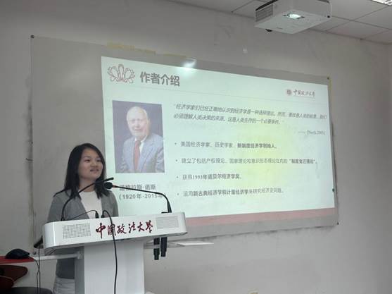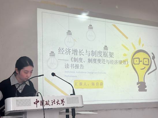 陈佳蔚同学在以《经济增长与制度框架》为题的报告中,梳理了全书内容,并分析了制度影响经济增长的三种机制:一是提供个人信用信息以促进合作;二是降低信念表达成本;三是明晰产权以减少交易费用。她通过家庭联产承包责任制的例子阐释了制度变迁理论,并尝试用适应性效率来解释中国为何能跳过资本主义阶段直接进入社会主义。陈佳蔚同学还注意到诺斯在案例研究法上的运用,并建议在面对难以通过实验或大规模调查研究的问题时,可以采用这种方法进行分析。