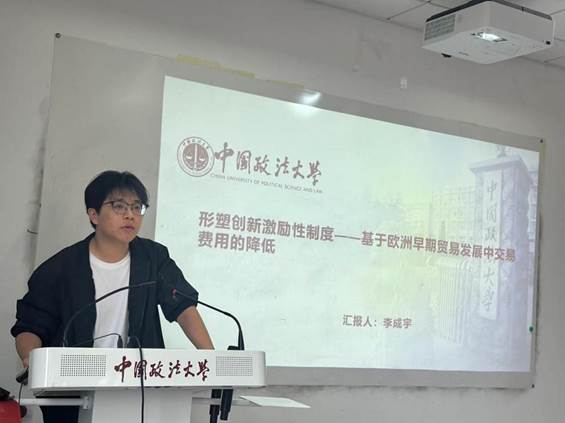 李成宇同学的汇报主题为《形塑创新激励性制度——基于欧洲早期贸易发展中交易费用的降低》。他以欧洲早期交易费用的降低为背景,认为这一降低是由于创新激励性制度的形成。李成宇同学提出,制度变迁是一个伴随着人们主观心智构念不断纳入的过程。他还指出,降低交易费用的创新产生于三个成本边际,并介绍了这三个方面的具体情况。最后,他针对这些内容提出了对现实问题的思考,例如城投债、影子银行以及高利贷规定等。