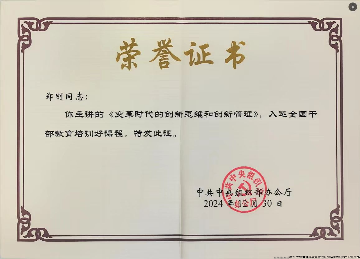 在全国干部教育培训高校基地中,浙江大学成绩斐然,是获奖课程最多的高校之一。其中,来自全国党建样板支部、第二批高校 “双带头人” 教师党支部工作室 —— 浙江大学管理学院创新创业与战略学系教工支部副书记郑刚教授主讲的《变革时代的创新思维与创新管理》,成功获评第四批全国干部教育培训好课程。这一成果意义重大,它也是创新系支部高校 “双带头人” 教师党支部书记 “强国行” 专项行动团队,以 “课程思政 - 实践育人” 双轮驱动打造 “强国浙里有我” 教育服务品牌的成果之一。
