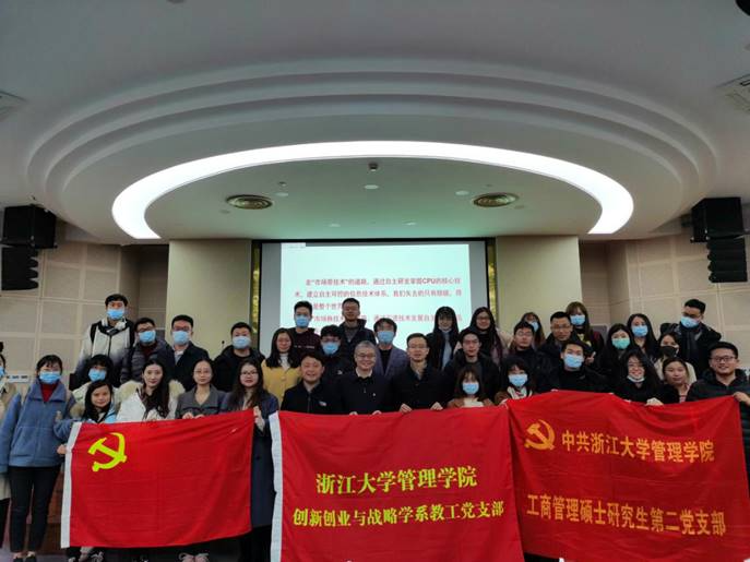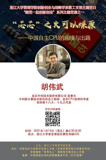 1月15日晚,创新创业与战略学系教工支部举行主题党日活动,邀请到党的十八大、十九大代表、龙芯中科技术有限公司董事长胡伟武来浙大做““芯芯”之火 可以燎原:中国自主CPU的困境与出路”党课,这也是创新系支部作为全国党建样板支部建设单位、全国高校“双带头人”教师党支部书记工作室建设单位举办的“跟党一起创新创业”系列党课在2021年举办的第1期活动。来自创新系支部及与党建“三结对”的大华技术股份国内党支部、研究生工商管理第二支部、MBA第二支部、全校对创新创业感兴趣的200多位师生通过现场和在线直播的方式参加了本次主题党日活动。