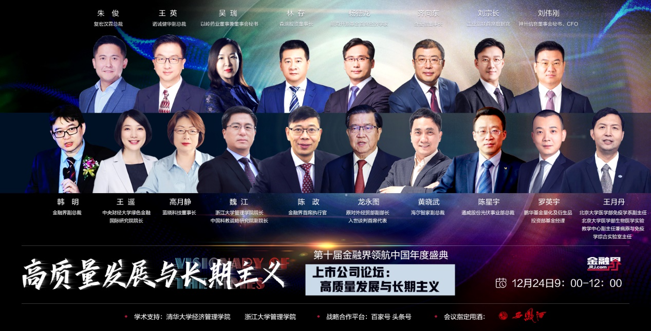 12月24日, 由金融界(jrj.com.cn)主办的“2021年金融界智能金融国际论坛暨第十届领航中国年度盛典”盛大召开,本次年会以“高质量发展与长期主义”为主题,邀请多位业界专家及企业家出席线上峰会,解密新发展格局的大背景下,中国与世界经济发展前景如何?2021年金融市场面临怎样的挑战和机遇?ESG、养老、新能源的未来何去何从?