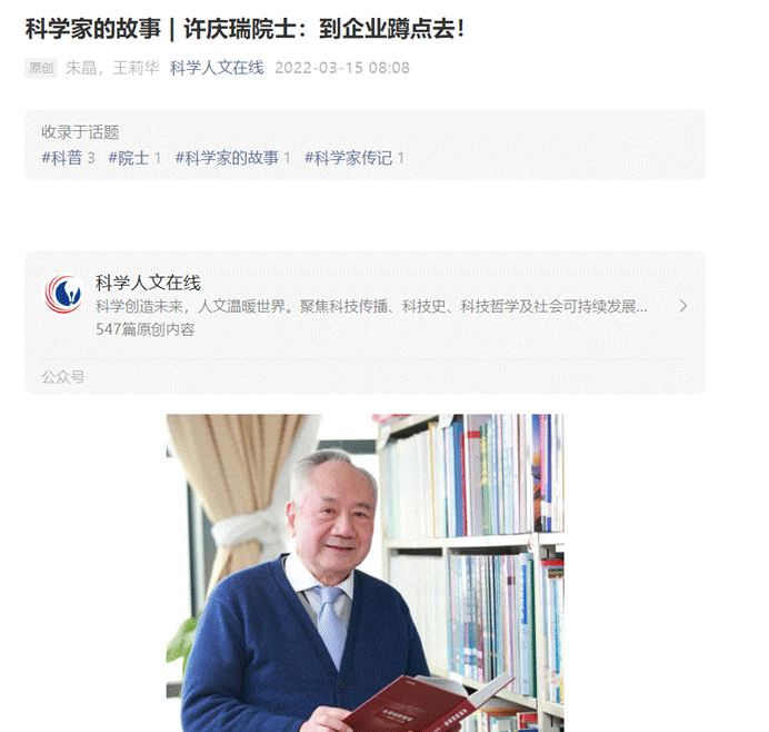 2022年3月15日,@科学人文在线 公众号“科学家的故事”栏目刊发《许庆瑞院士:到企业蹲点去!》,报道浙江大学管理学院创新创业与战略学系教工支部老党员先进事迹。