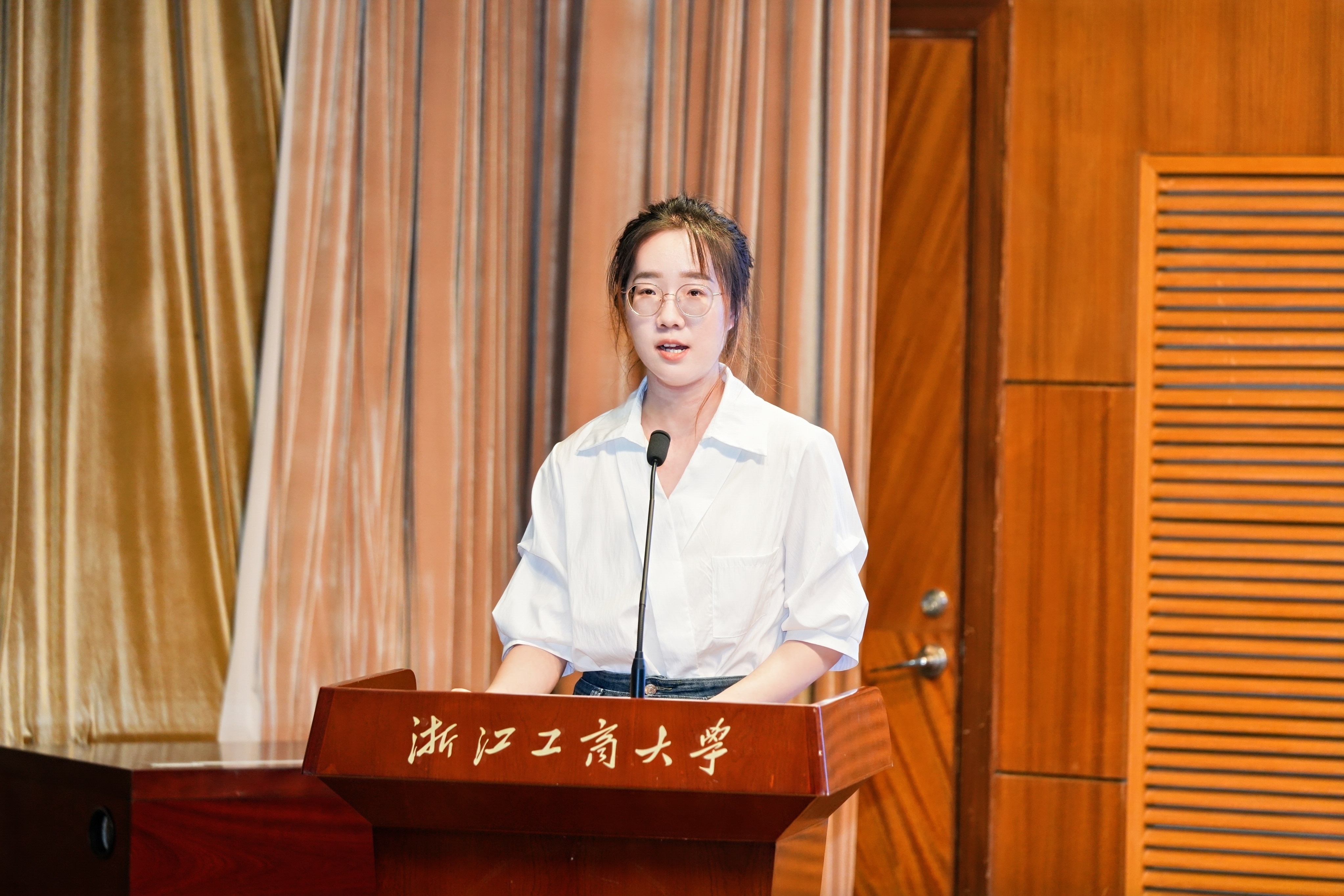 2024级统计专业研究生金佩颖作为新生代表发言。金佩颖同学首先回忆高考与本科多年以来的汗水与星光。站在了研究生的新起点上,面对新征途,她用四点理想追求来迎接沉甸甸的责任与前所未有的挑战:一是勤学善思。科研之路漫漫,学会如何在浩瀚的知识海洋中,筛选出有价值的信息,构建自己的知识体系,不断追求卓越,才能勇攀学术高峰。;二是任重道远。知识的学习与积累离不开无数个平凡日夜的积累与努力,鲜花和掌声背后是无数的泪水与汗水;三是知行合一。唯有将所学知识付诸实践,才能真正理解其内涵,发现其实际的应用价值;四是心怀感恩。报答春光知有处,永葆感恩之心是人生的必修课。最后,她号召大家勇担青春使命,直面未来,不惧挑战,做开眼看世界的“统数人”!